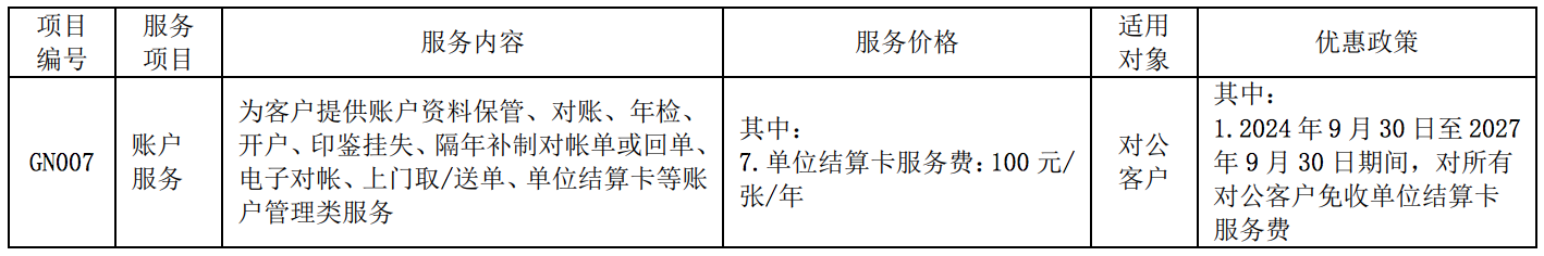 在前期已对所有对公客户免收账户管理费和年费的基础上,所有对公客户免收单位结算卡服务费的优惠政策延长三年。